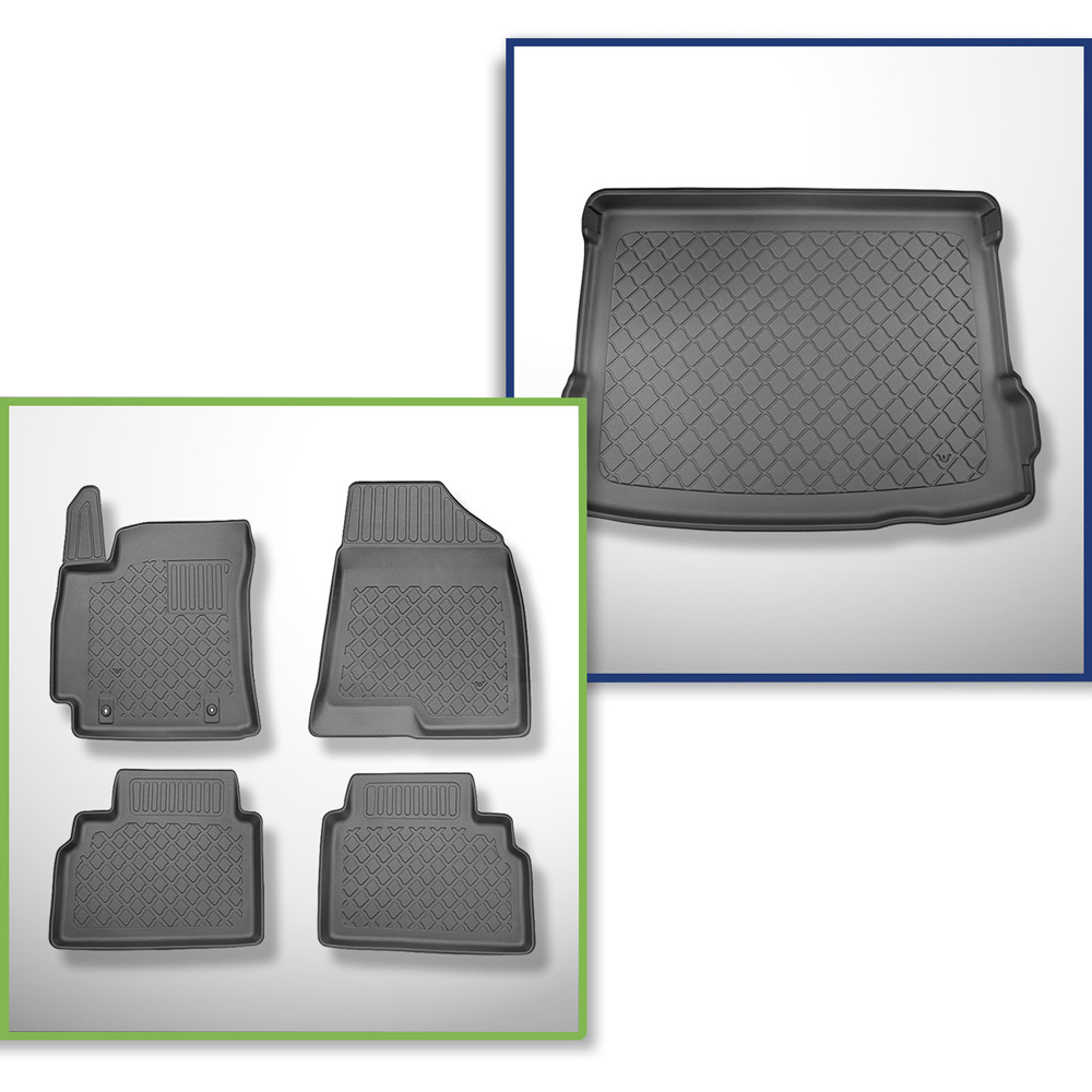 Conjunto de tapetes de bagageira e tapetes de carro feitos sob medida para Hyundai Kauai II SUV (04.2023-....) - parte superior do porta-malas; base móvel na posição mais alta; com e sem subwoofer; não para a versão elétrica; também com tração híbrida